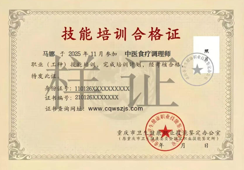 重庆市卫生健康职业技能鉴定办公室中医食疗调理师证书样本