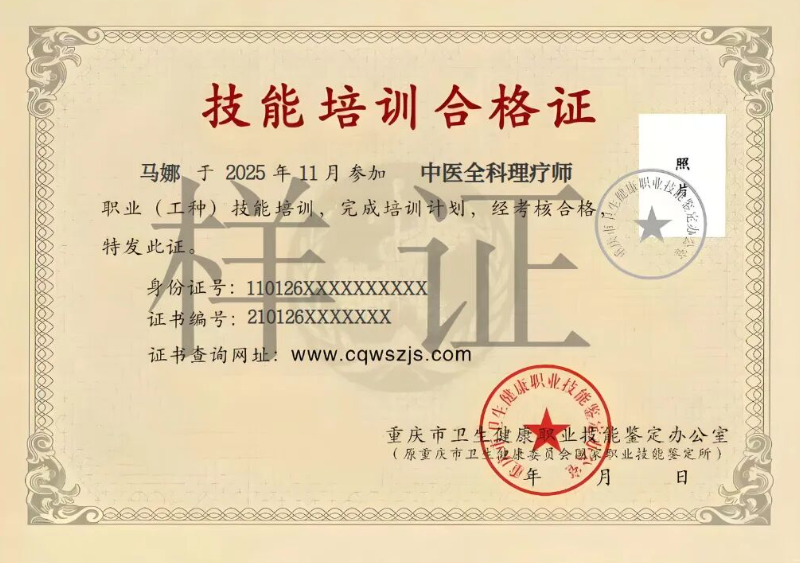 重庆市卫生健康职业技能鉴定办公室中医全科理疗师证书样本